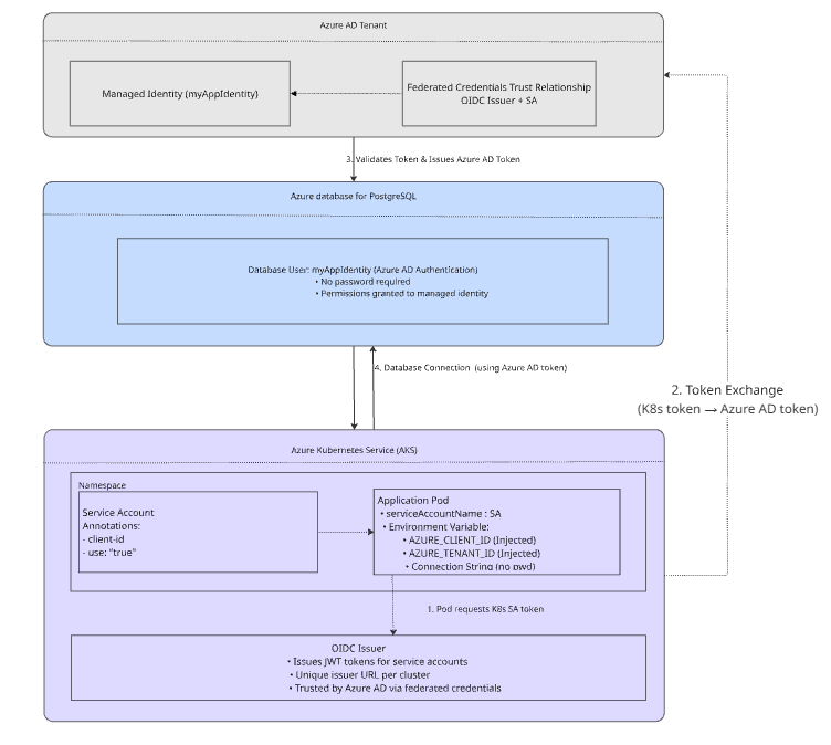 This approach significantly improves security by removing the need to store database passwords in application code or Kubernetes secrets, while providing seamless authentication through Azure AD integration and automatic token exchange via federated credentials.