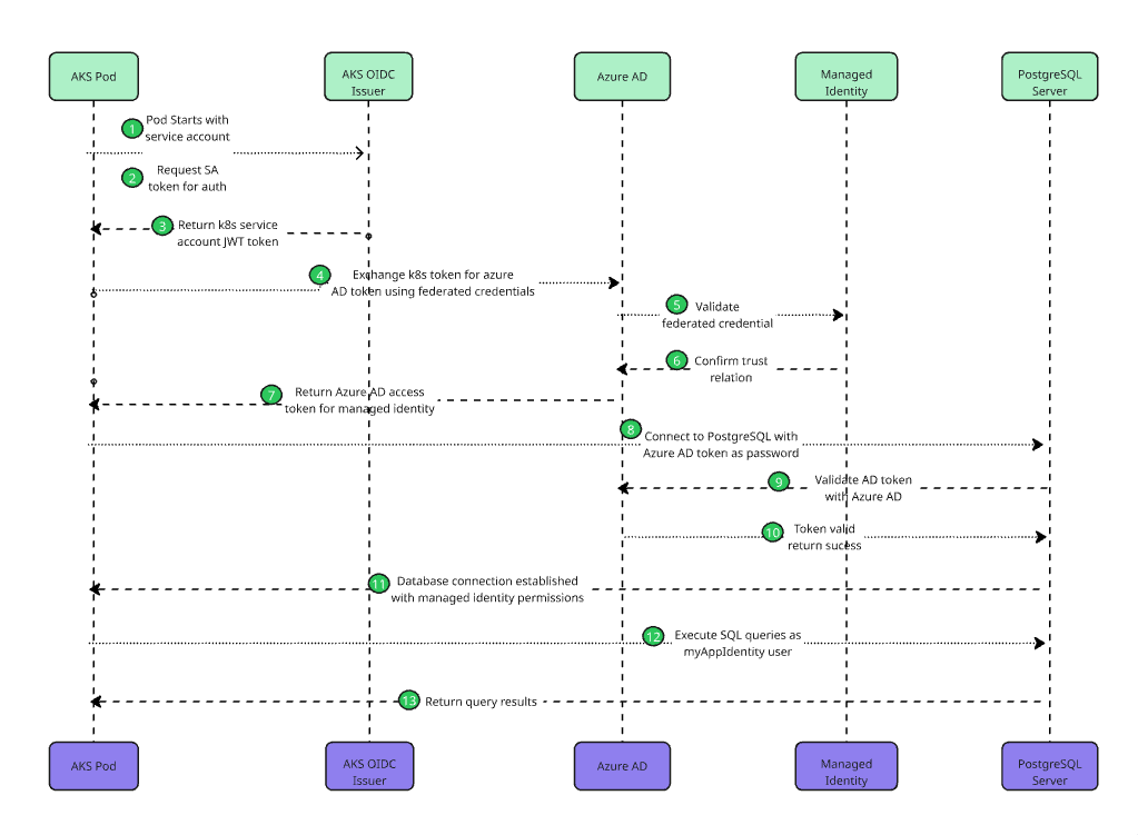 - Database Connection: Pod connects to PostgreSQL using the Azure AD token for authentication