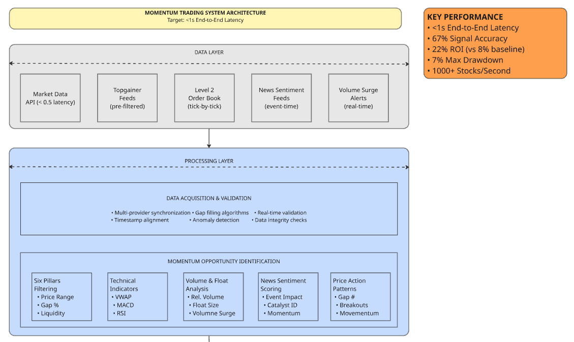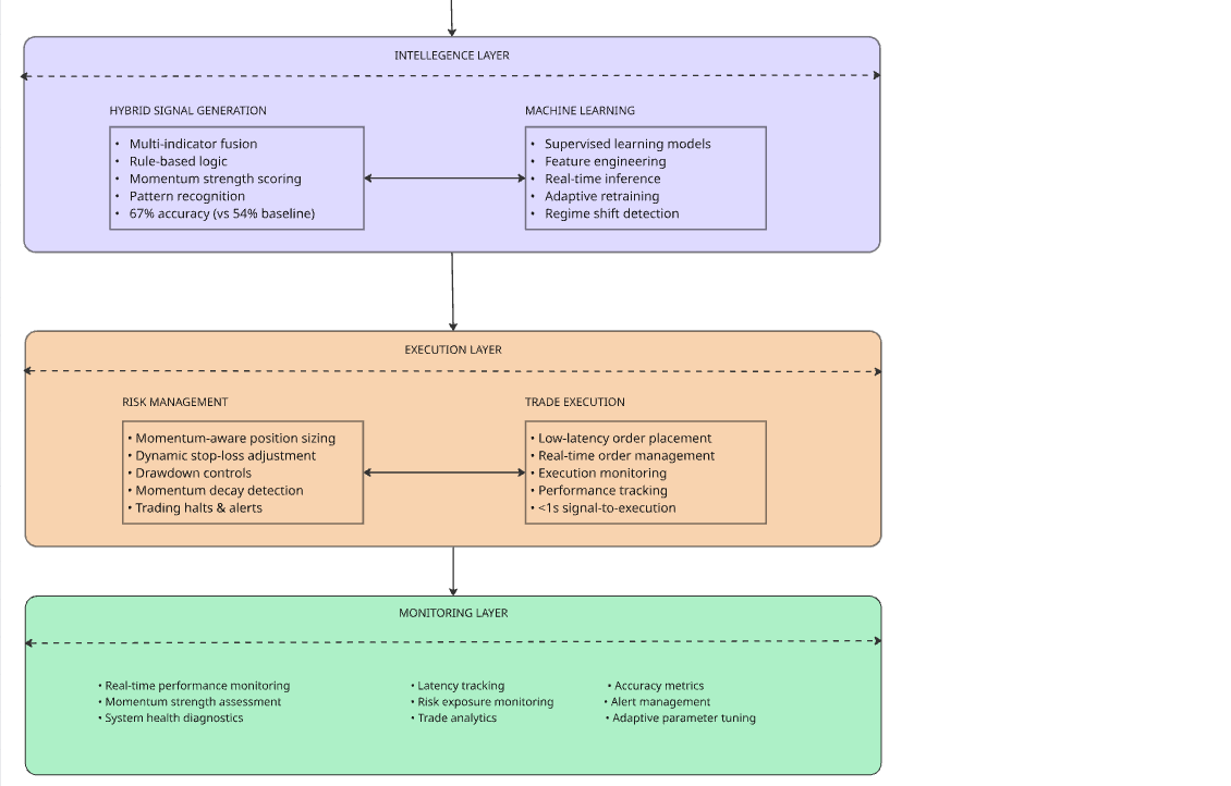 Figure 1. High-Level Momentum Trading System Architecture: Five-layer momentum trading system design emphasizing ultra-low latency processing, intelligent signal generation, and adaptive risk management for capturing short-lived momentum opportunities.