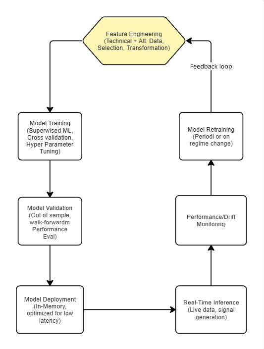 - The system includes automated pipelines for training, validating, and deploying supervised learning models (including ensemble methods [14] and neural networks [12]) using historical market data and engineered features.